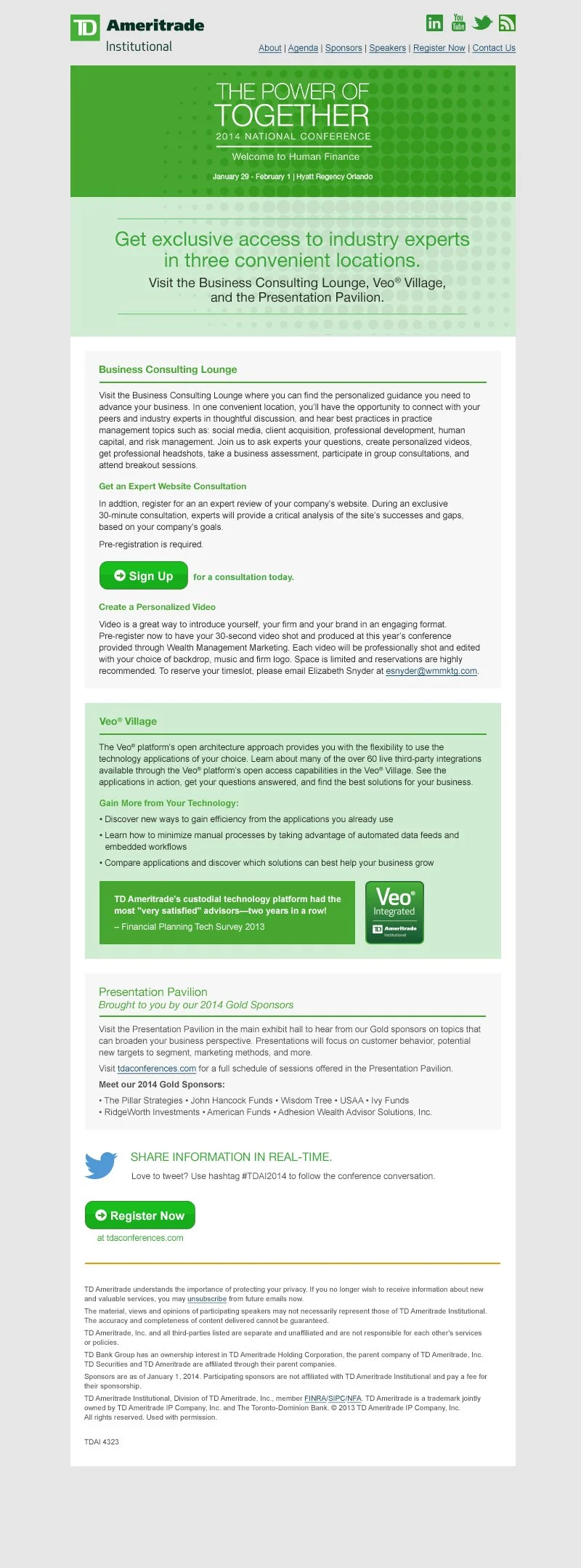 I designed all signage and accompanying marketing emails for the 2014 TD Ameritrade Institutional National conference in Orlando Florida that was attended by over 3000 investment advisors.